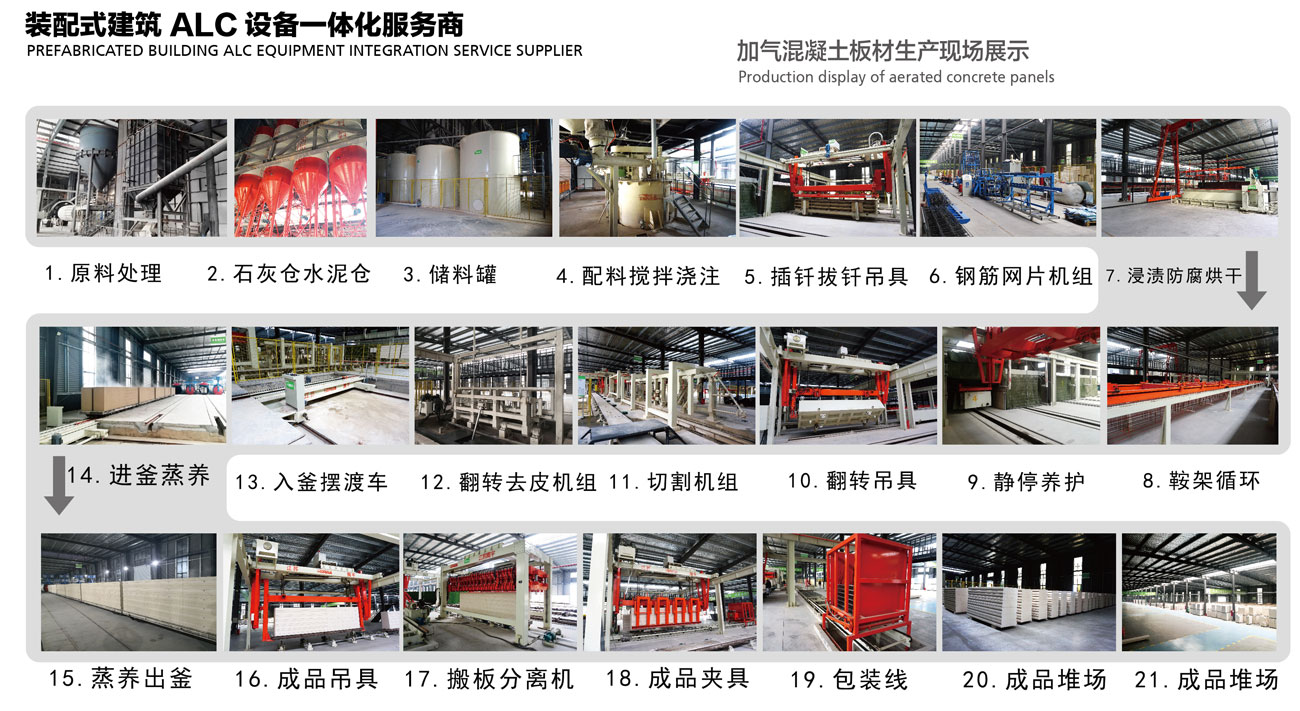 1.原料處理 2.粉煤灰/沙子處理 3.料漿攪拌存儲(chǔ) 4.配料攪拌及澆筑 5.靜停養(yǎng)護(hù) 6.翻轉(zhuǎn)及組模吊具 7.坯體縱切/橫切記8.坯體翻轉(zhuǎn)臺(tái)